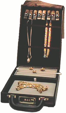 With Combination lock 12-1/2 x 8-3/4 x 2-1/2”H Case includes multiple chain snaps, slotted ring tray & 2 Velvet pads. 3-digit combo lock. Faux leather with velvet interior. Looks like an attache case.
