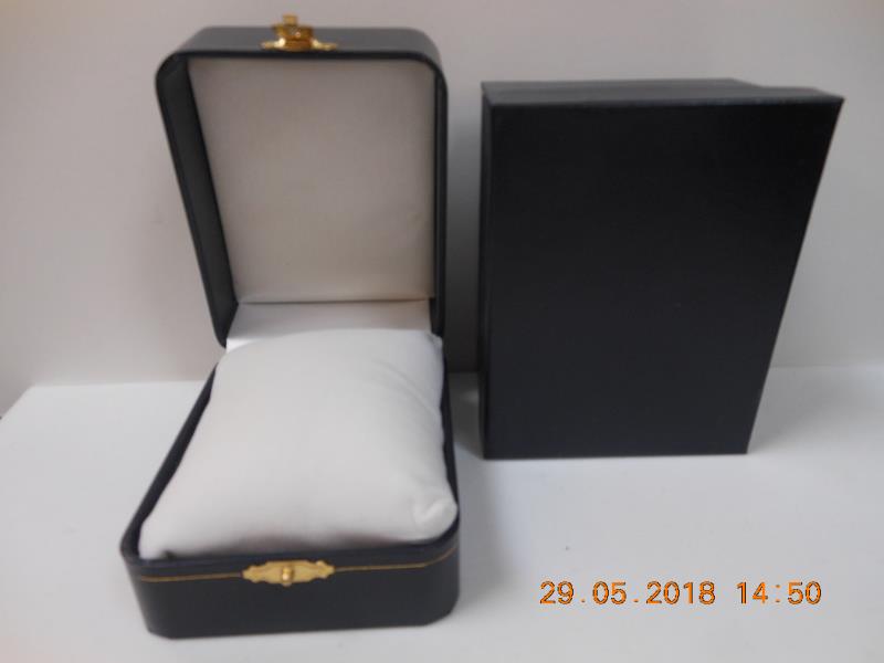 • High-end leatherette material • Accented with clasp lock and gold tooling • Navy blue exterior and white plush interior.