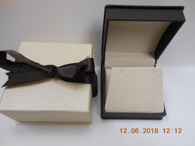 Brown and cream rolltop earring or pendant box. Comes with an outside box complete with ribbon for instant gift wrap. 3.25X 3.25 X 1 3/8 inches