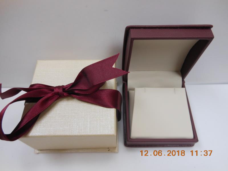 Burgundy and cream rolltop medium sized earring or pendant box. 2 1/2 X 2 1/2 X 2 X2 1/8 IN Comes with an outside box complete with ribbon for instant gift wrap.s