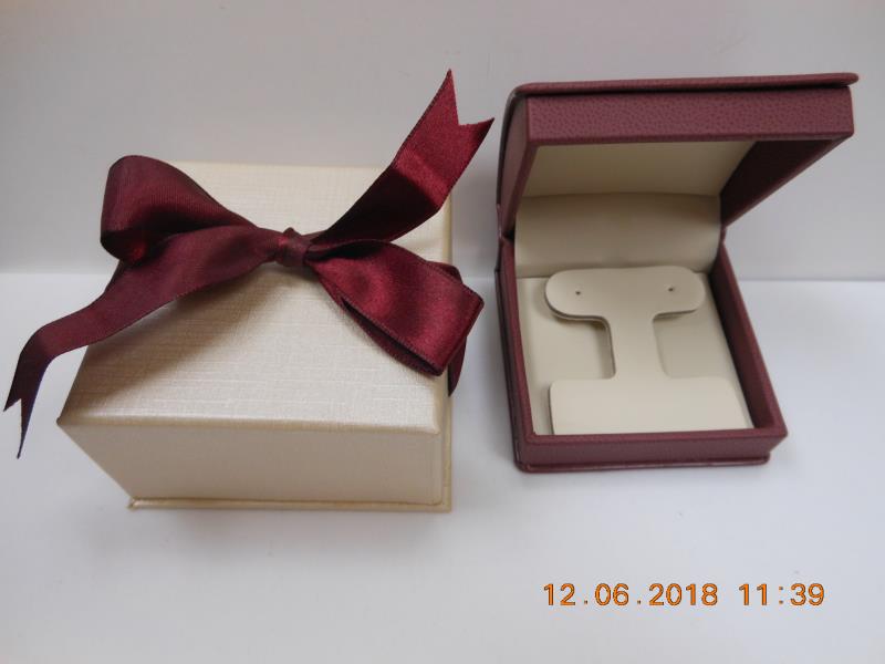 Burgundy and cream rolltop t bar earring box. Comes with an outside box complete with ribbon for instant gift wrap. 3.25X 3.25 X 1 3/8 inches