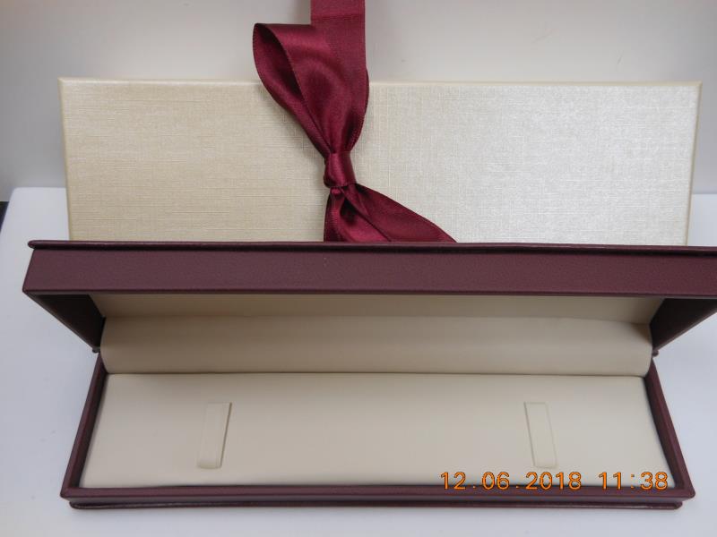 Burgundy and Cream rolltop bracelet box. 8 5/8 X 2 1/4 X 1 3/4 INCHES Comes with an outside box complete with ribbon for instant gift wrap.