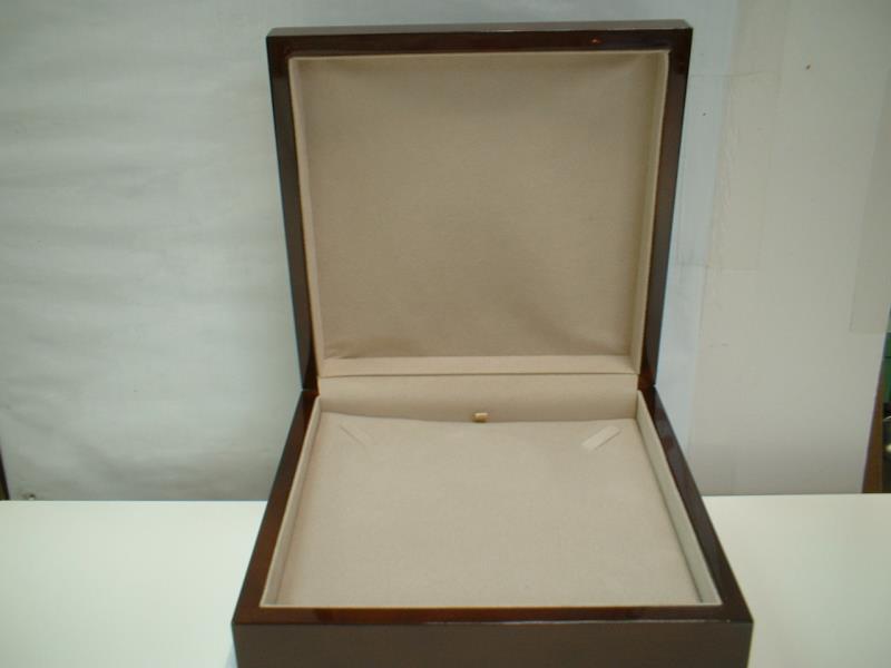 Exquisite wooden lacquered box with supple suede interior. Two-piece packer included.