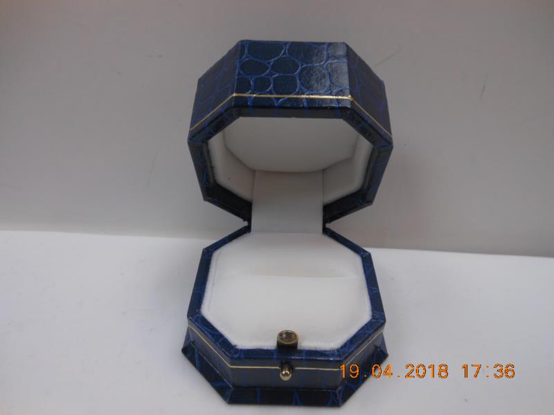 A truly beautiful ring box in an octagon shape. Gold tooling and fastener. Blue croc design outside and white velvet inside.