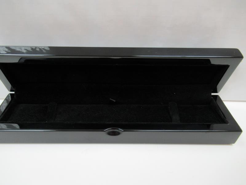 A delightful line of glossy lacquered jewellery boxes. The bracelet has a suede bed with tabs to hold the item securely.