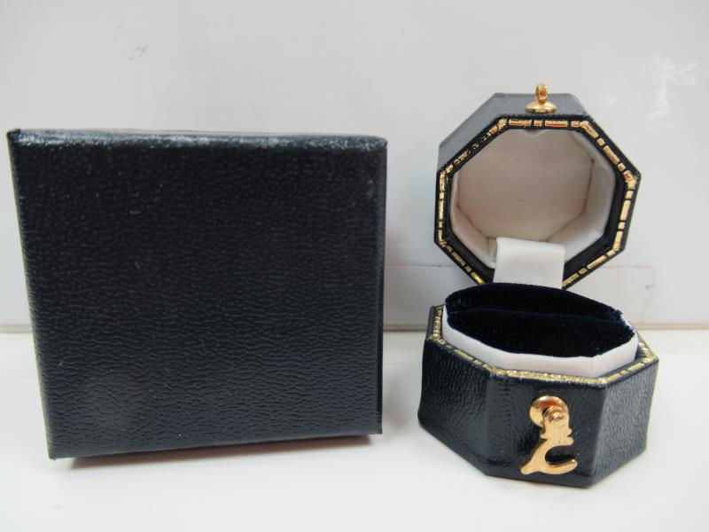 A very attractive ring box is covered in dark blue leatherette with a blue velvet ring bed and satin in the lid. These boxes are only one inch wide, perfect for going into a pocket.