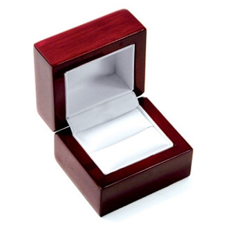 Ring box in Rosewood finish. White leatherette inside. 2¾ x 2½ x 2⅛ 2 piece wrapper.