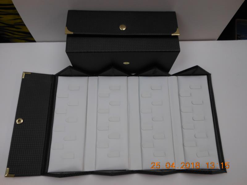 Ring case holds 36 rings. Made of carbon fibre. Folds up to a 4 inch cube. Holds 36 rings.