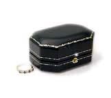 Each ring box is carefully covered and lined using first quality materials. The four standard colours are black, blue, green and red Options available include internal foil blocked printing and on case tooling. Octagonal white outer box.
